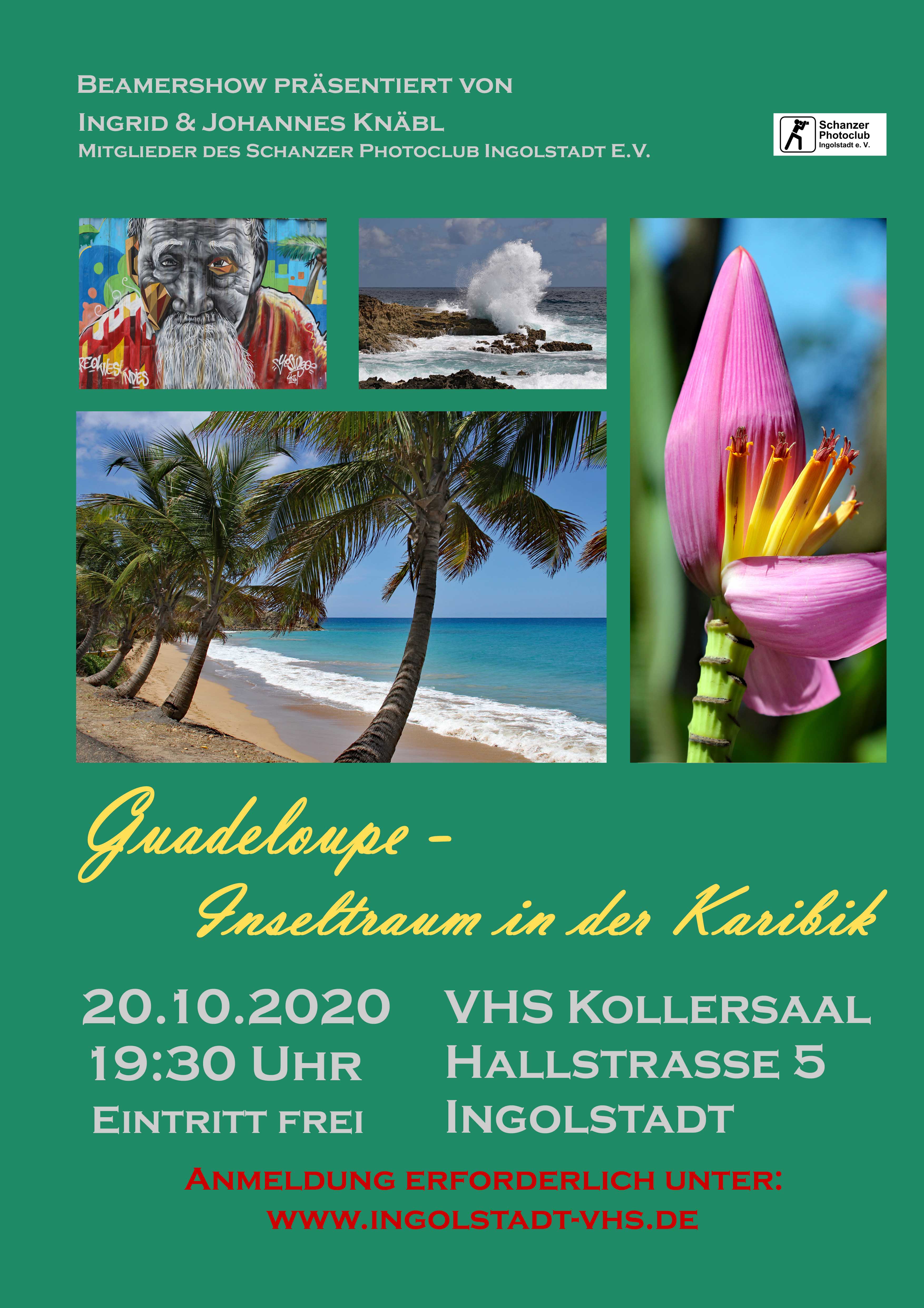 Ingrid und Johannes Knäbl zeigen ihre Bilder aus Guadeloupe am 20.10.2020 um 19:30 Uhr im Kollersaal der VHS Ingolstadt. Der Eintritt ist wie immer frei, eine Anmeldung bei der VHS unter 0841-305 1852 oder auf www.ingolstadt-vhs.de Kursnummer AL03-001A aber aufgrund der limitierten Plätze und der geltenden Coronamaßnahmen erforderlich.
