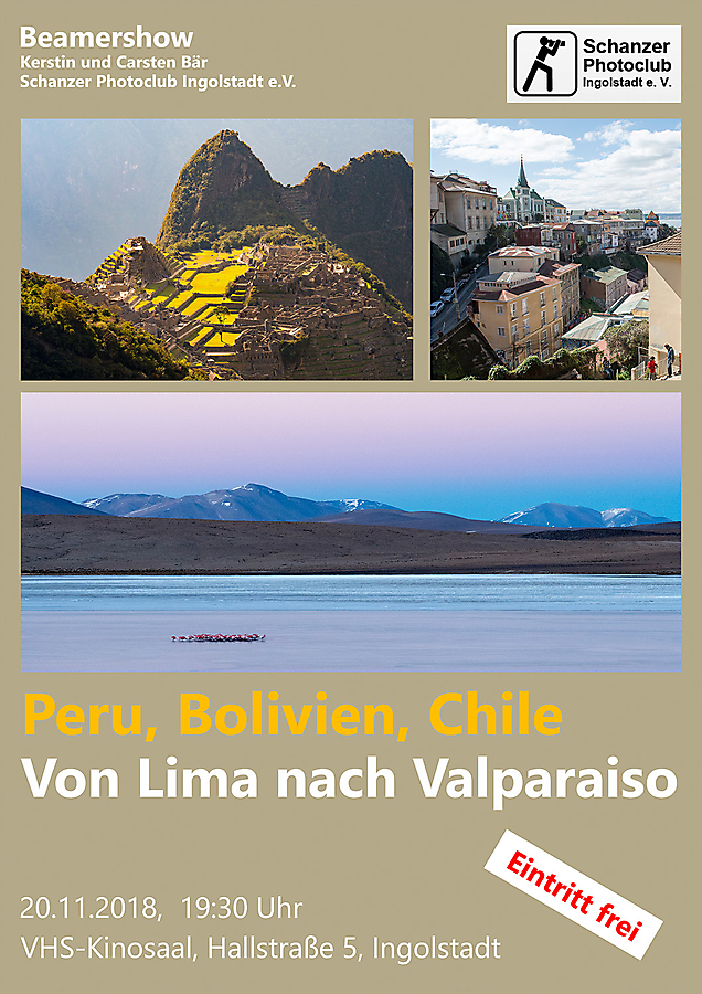 In Lima startete unsere vierwöchige Reise durch 3 Länder Südamerikas. Die wunderbare Tierwelt der Ballestas-Inseln oder des Colca-Tals faszinierte uns. Rätselhafte Wüstenscharrbilder bei Nasca, jahrhundertealte Zeugnisse der Inka-Kultur bei Cusco und in Machu Picchu ließen uns staunen. Auf der Hochebene der Anden, umgeben von schneebedeckten 6000m-hohen Berggipfeln, reisten wir vom Titicaca-See zum Salar de Uyuni, der größten Salzpfanne der Erde. Von dort ging es offroad mit dem Geländewagen weiter, vorbei an von Flamingos bewohnten Lagunen, an Geysiren, bis zur Atacama-Wüste. Wir lernten auf unserer Reise abgelegene Dörfer auf dem Land und pulsierende Metropolen wie Arequipa, La Paz, Santiago de Chile oder Valparaiso kennen, deren südamerikanisches Flair uns in seinen Bann zog.