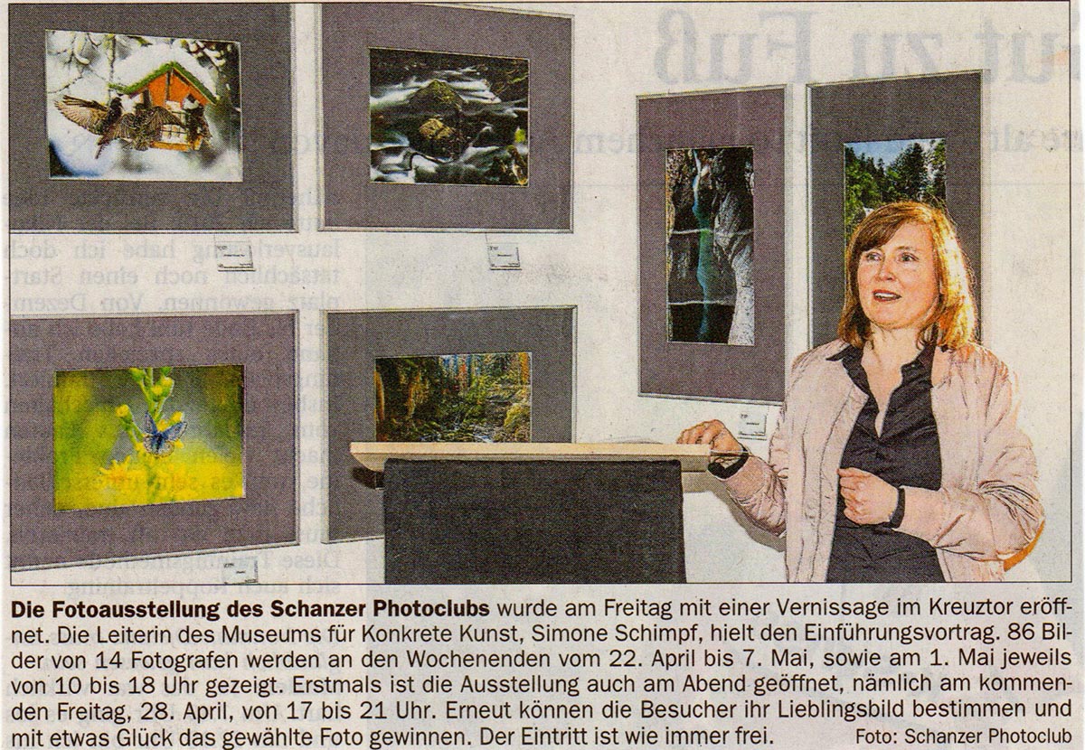 In Ihrer Laudatio hob die Leiterin des Museums für Konkrete Kunst, Frau Dr. Simone Schimpf, bei der Eröffnung der Fotoausstellung des Schanzer Photoclubs im Kreuztor, die Vielfalt und die hohe Qualität der ausgestellten Fotos hervor. 86 Bilder von 14 Fotografen werden an den Wochenenden vom 22. April bis 07. Mai, sowie am 1. Mai gezeigt (jeweils von 10 - 18 Uhr) gezeigt. Erstmals ist die Ausstellung auch am Abend geöffnet, nämlich am Fr. 28. April von 17:00 – 21:00 Uhr.