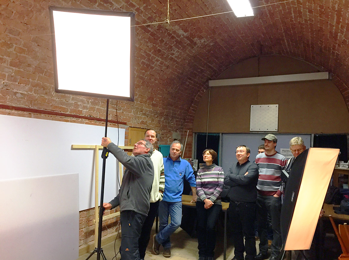 Zehn Mitglieder und Gäste nahmen mit großem Interesse an der Einführung in unser Fotostudio und im Umgang mit den Studiogeräten teil. Gert Schmidbauer, der sich mit der Studioanlage aufgrund seiner langjährigen Arbeiten bestens auskennt, leitete den Workshop und vermittelte den Teilnehmern sehr viel Wissenswertes aus der Theorie und vor allem aus der Praxis.