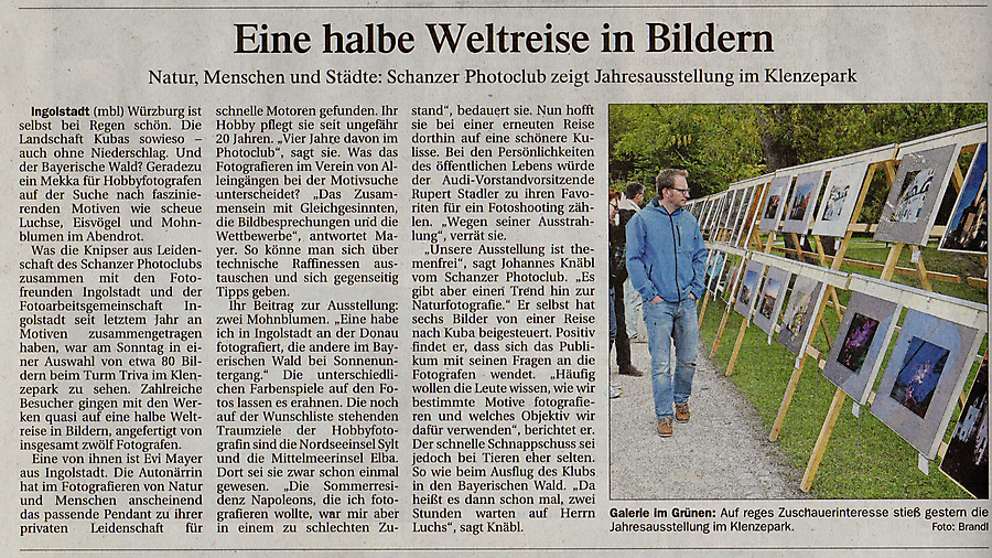 Zusammen mit der „Fotoarbeitsgemeinschaft Ingolstadt“ und den „Fotofreunden Ingolstadt“ präsentiert der Schanzer Photoclub auch dieses Jahr seine Arbeiten im Rahmen einer Jahresausstellung. Die themenfrei angelegte Open-Air-Ausstellung zeigt eine vielfältige Auswahl an Fotografien, die das weite Spektrum und die unterschiedlichen Schwerpunkte der Fotografen wiederspiegelt.- Details