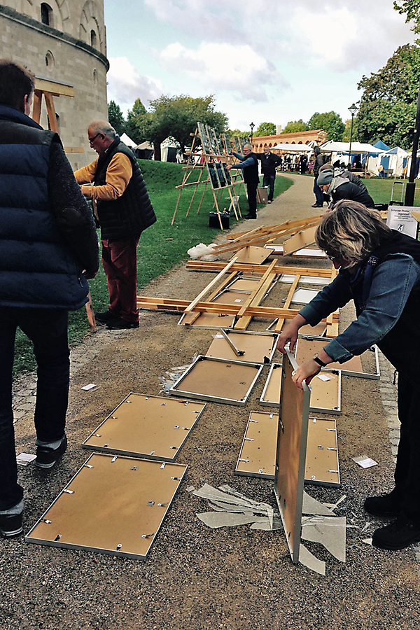 Leider hatten wir die Windverhältnisse etwas unterschätzt und so begann die Ausstellung mit einem grossen Knall. Drei unserer sieben Bilderständer wurden vom Wind umgeworfen und das ein oder andere Glas und Bild ging zu Bruch.
