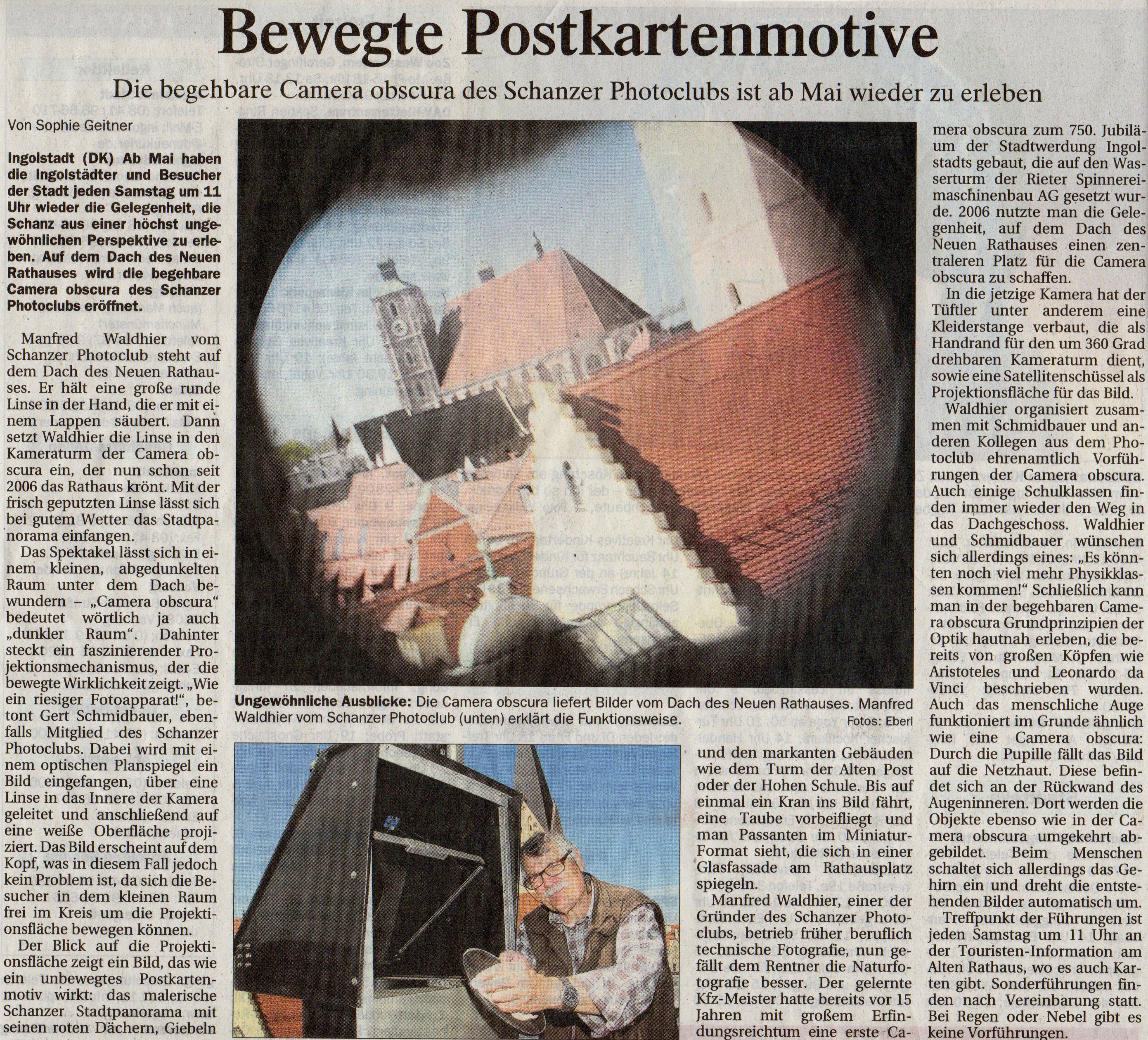 Für alle die keinen Donaukurier haben, hier der sehr schöne Artikel zu unserer Camera obscura vom 28.04.15. (zum Vergrößern bitte das Bild anklicken)